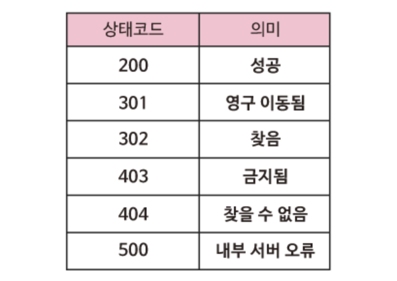 - 서버는 클라이언트에게 요청의 결과를 나타내는 상태 코드를 함께 보내주면서 응답한다. 서버에 사용자가 찾는 페이지가 있고 성공적으로 응답할 수 있으면, 서버는 상태 코드 200을 보낸다. 요청이 성공적으로 처리되었다는 의미이다. 찾을 수 없을 때에는 404와 함께 응답한다.