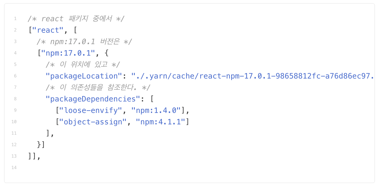 예를 들어, `react` 패키지는 `pnp.cjs` 파일에서 다음과 같이 나타납니다.