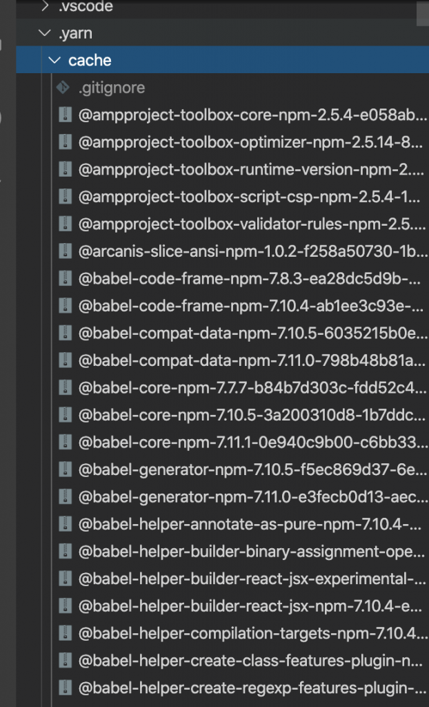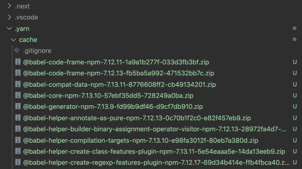 아래 이미지는 zip으로 묶인 라이브러리가 저장된 `.yarn/cache`폴더 입니다.