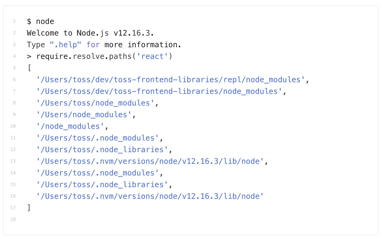 예를 들어서, `/Users/toss/dev/toss-frontend-libraries`폴더에서 `require()`문을 통해서 `react`패키지를 불러오는 상황이라고 가정해보겠습니다. 예시는 토스 아티클을 참조하여 가져오게 되었습니다.