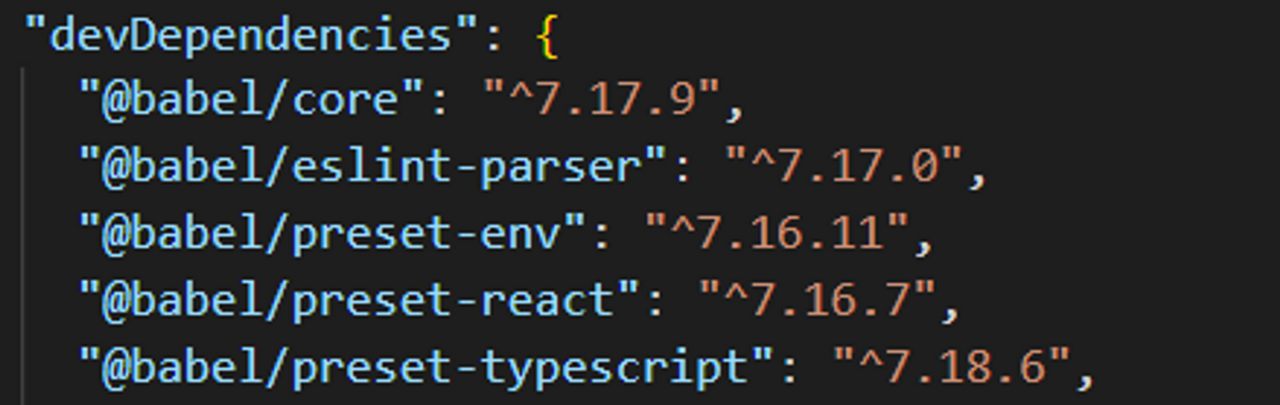 사진에 보면 `^(캐럿)`표시가 되어있는데, 이는 가장 앞 숫자인 메이저 숫자를 제외한 두번째, 세번째 숫자(마이너 패치)까지는 변경을 허용한다는 의미입니다. 현재 사진 속 바벨 코어 버전이 `^7.17.9` 이기때문에 메이버전인 7이 유지된 상태에서 모듈버전이 바뀐다는 것을 허용하게 됩니다. `7.18.0`이나 `7.17.0`은 모두 허용한다고 볼 수 있겠습니다.